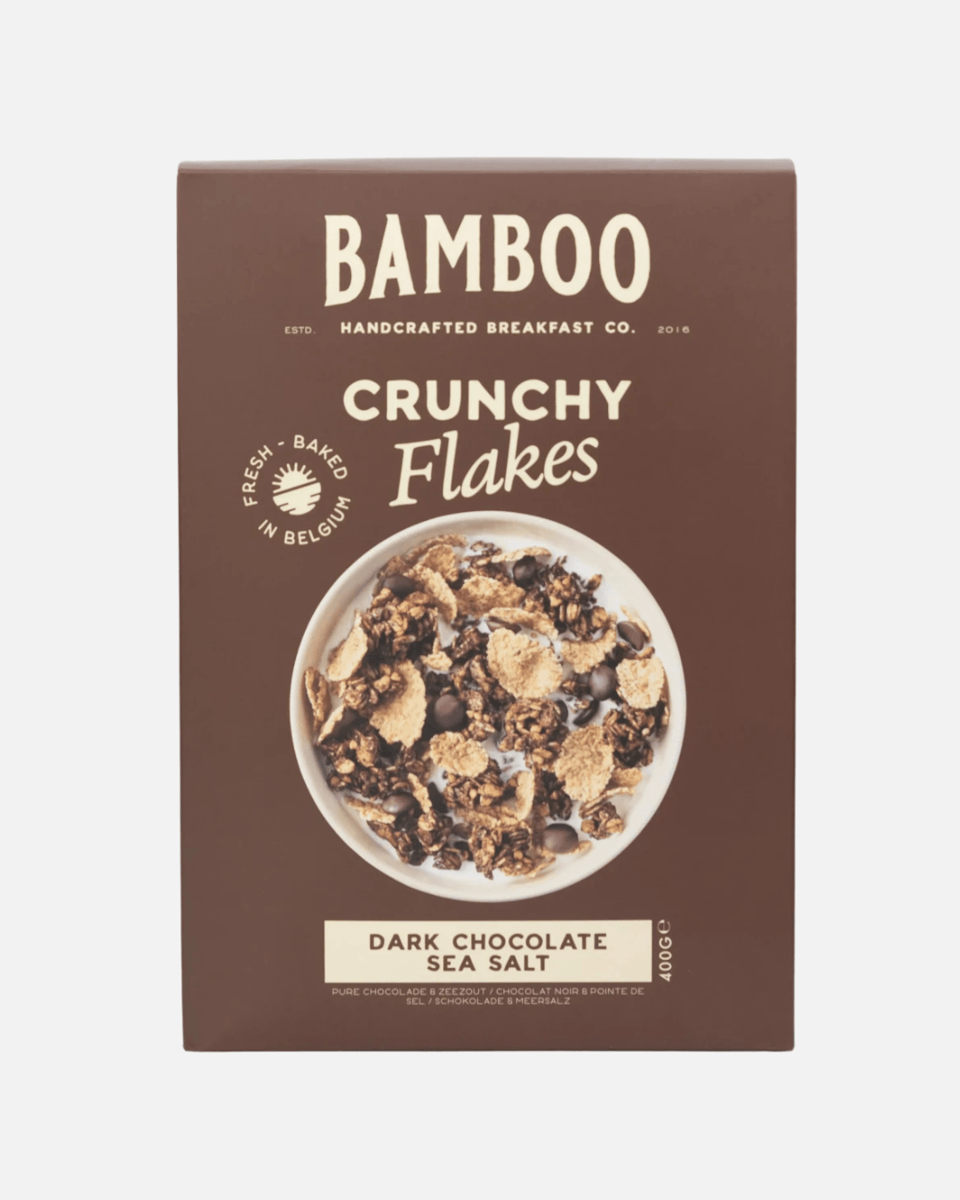 Knusprige Vollkornflocken und Cluster mit Zartbitterschokolade und einer feinen Note Meersalz sorgen für ein intensiv schokoladiges, ausgewogenes Geschmackserlebnis. Hergestellt aus Vollkornweizen, Hafer, Saaten und Kokosblütenzucker wird Crunchy Flakes Dark mit Schokolade und Meersalz von Bamboo Breakfast zum vielseitigen Begleiter für Frühstück oder kleine Genussmomente. Ideal mit Milch oder Joghurt.